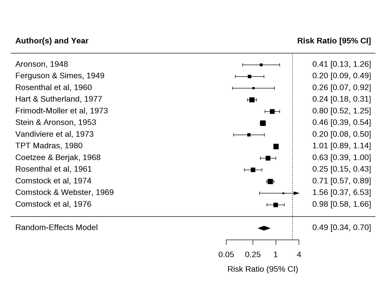 다음 메타분석 결과를 Forest Plot으로 시각화하세요: