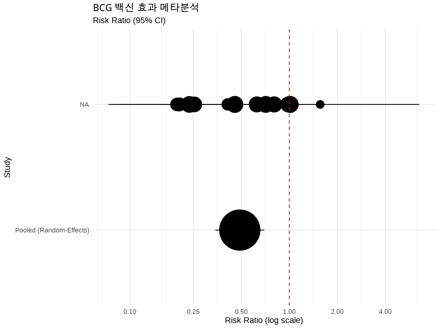 - 메타분석 결과를 Forest Plot으로 시각화 (`metafor` )