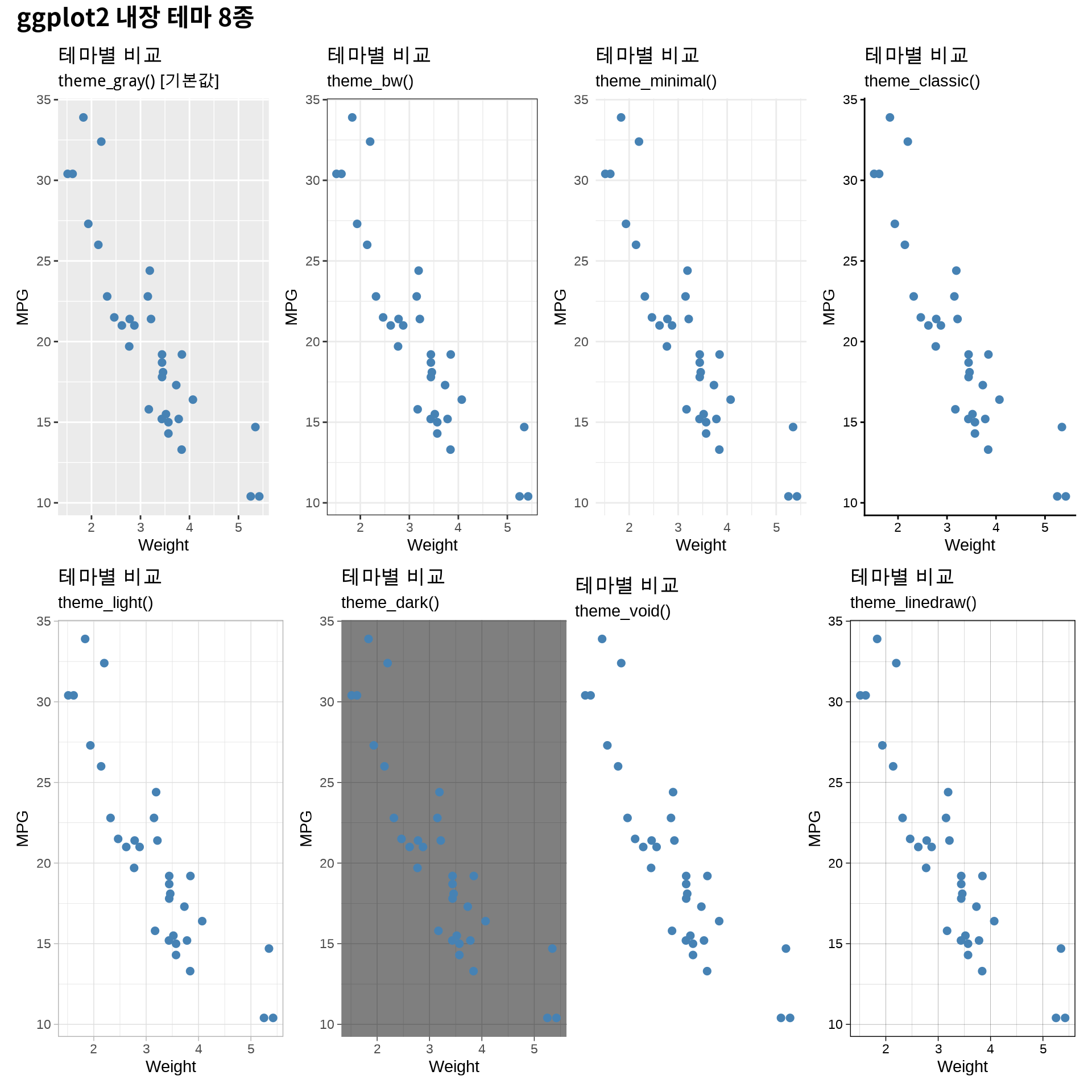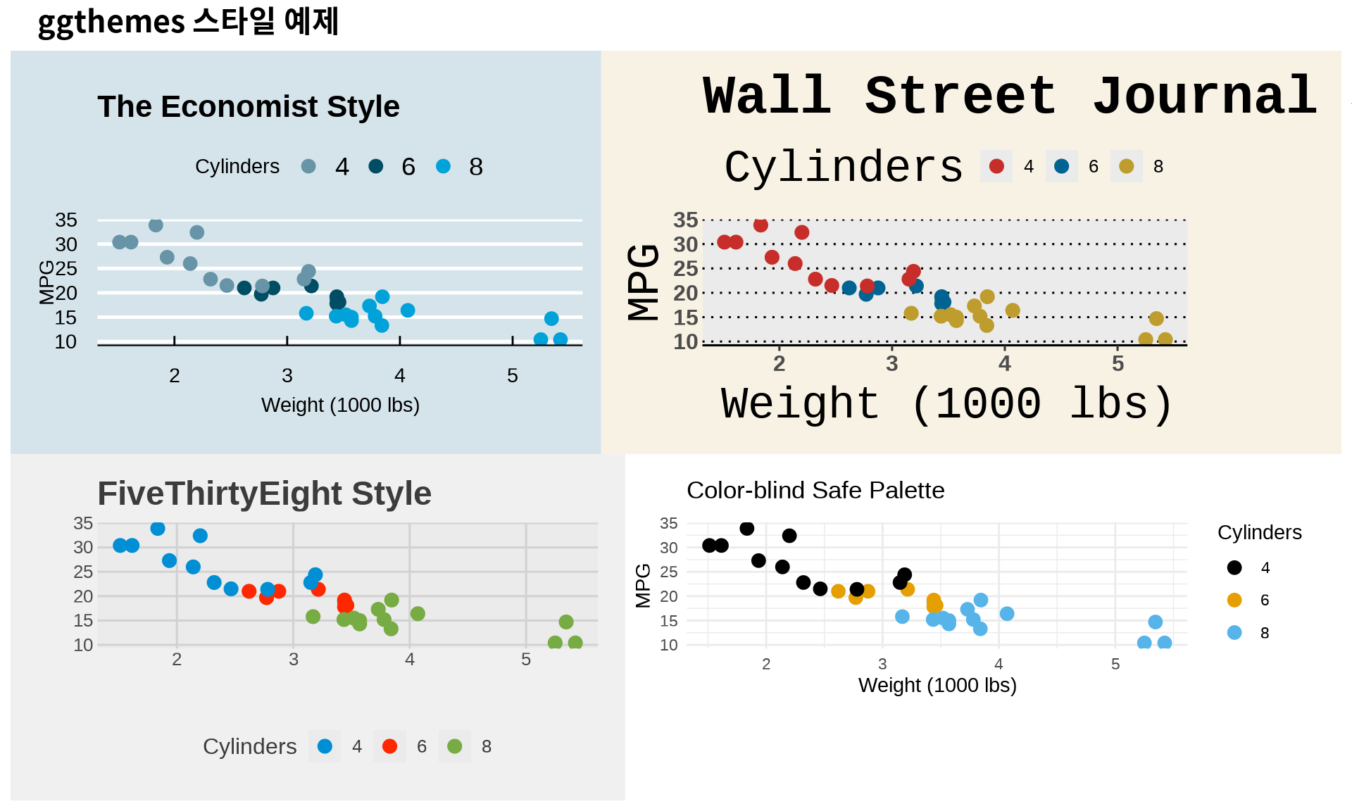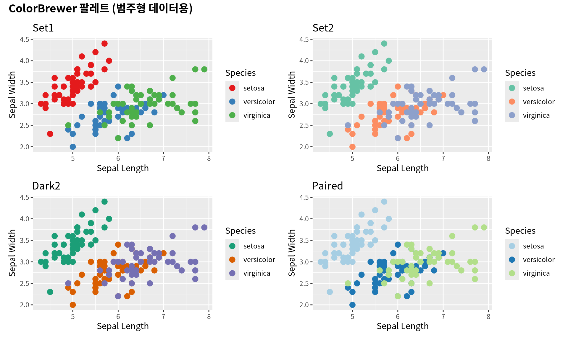 library(RColorBrewer)base_plot<-ggplot(iris, aes(x =Sepal.Length, y =Sepal.Width, color =Species))+geom_point(size =3)+labs(x ="Sepal Length", y ="Sepal Width")p_set1<-base_plot+scale_color_brewer(palette ="Set1")+labs(title ="Set1")p_set2<-base_plot+scale_color_brewer(palette ="Set2")+labs(title ="Set2")p_dark2<-base_plot+scale_color_brewer(palette ="Dark2")+labs(title ="Dark2")p_paired<-base_plot+scale_color_brewer(palette ="Paired")+labs(title ="Paired")(p_set1|p_set2)/(p_dark2|p_paired)+plot_annotation( title ="ColorBrewer 팔레트 (범주형 데이터용)", theme =theme(plot.title =element_text(size =14, face ="bold")))
