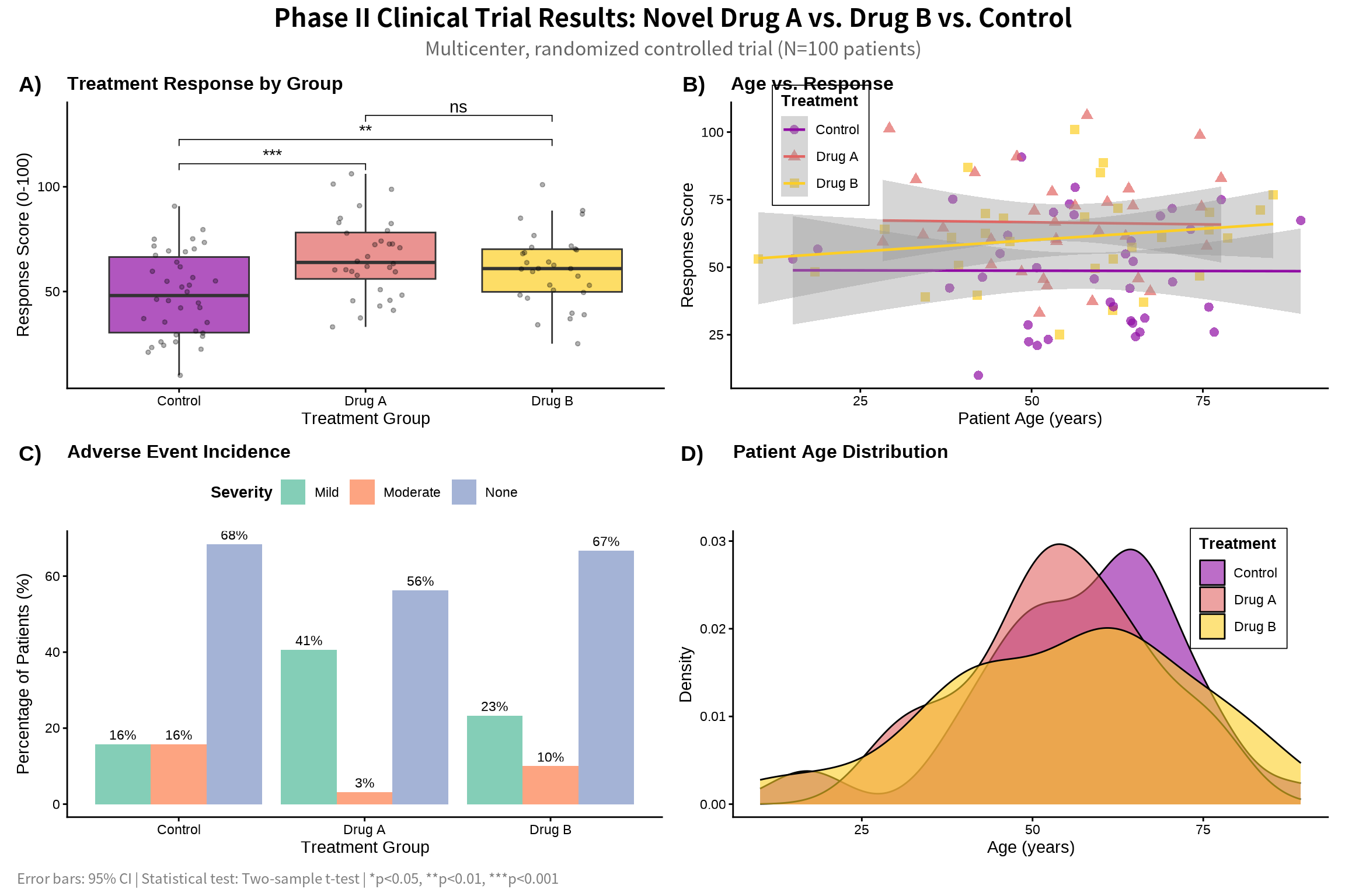 학술 논문에서는 여러 그래프를 하나의 Figure로 조합해야 합니다 (e.g., Figure 1A, 1B, 1C). patchwork 패키지는 직관적인 연산자로 이를 가능하게 합니다: