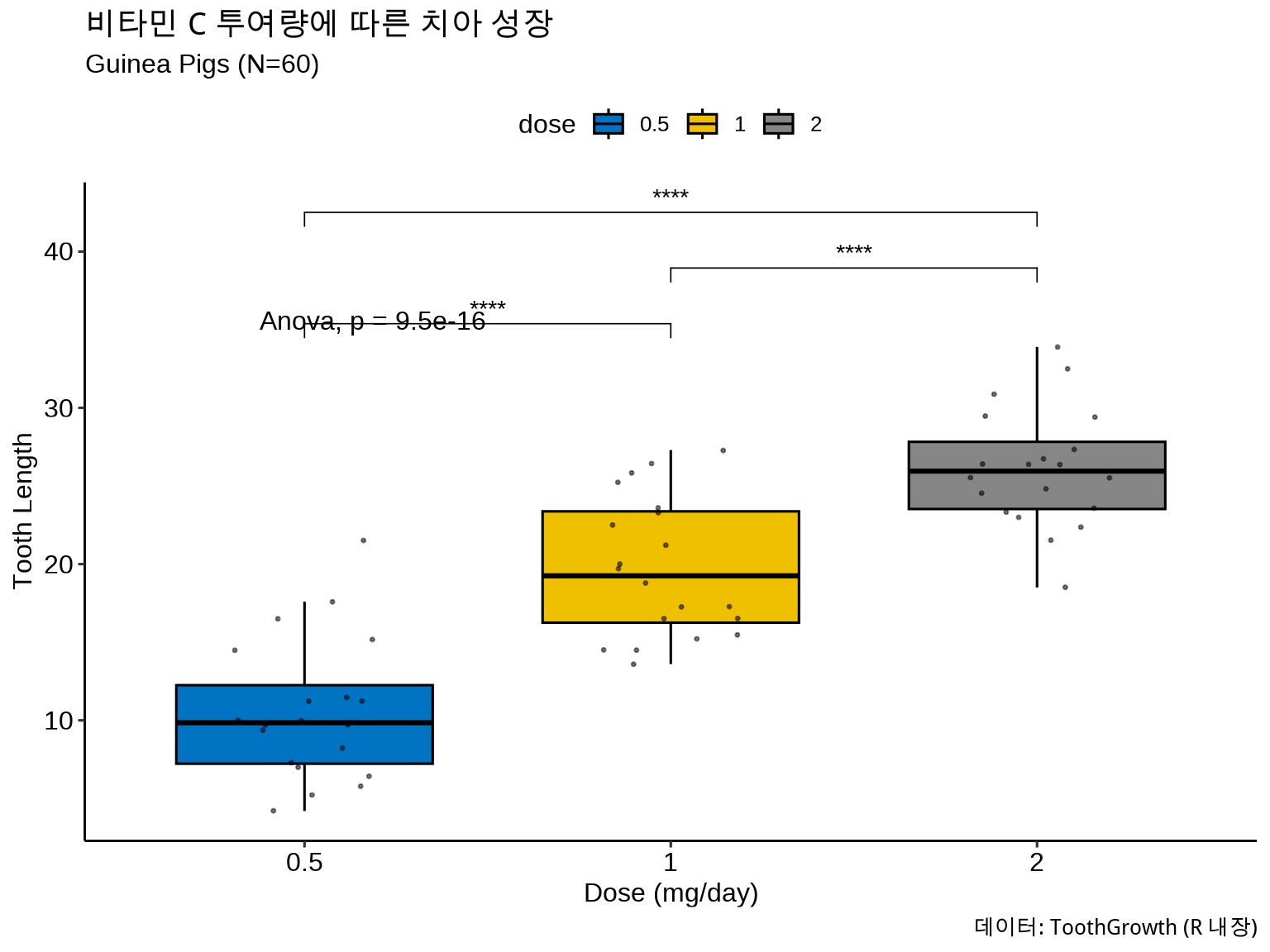 library(ggpubr)# ToothGrowth 데이터: 비타민 C 투여량에 따른 치아 성장ggboxplot(ToothGrowth, x ="dose", y ="len", fill ="dose", palette ="jco", # Journal of Clinical Oncology 색상 add ="jitter", # 개별 점 추가 add.params =list(size =0.5, alpha =0.5))+stat_compare_means( comparisons =list(c("0.5", "1"), c("1", "2"), c("0.5", "2")), label ="p.signif", # *, **, *** 표시 method ="t.test")+stat_compare_means(label.y =35, method ="anova")+# 전체 ANOVAlabs( title ="비타민 C 투여량에 따른 치아 성장", subtitle ="Guinea Pigs (N=60)", x ="Dose (mg/day)", y ="Tooth Length", caption ="데이터: ToothGrowth (R 내장)")+theme_pubr()