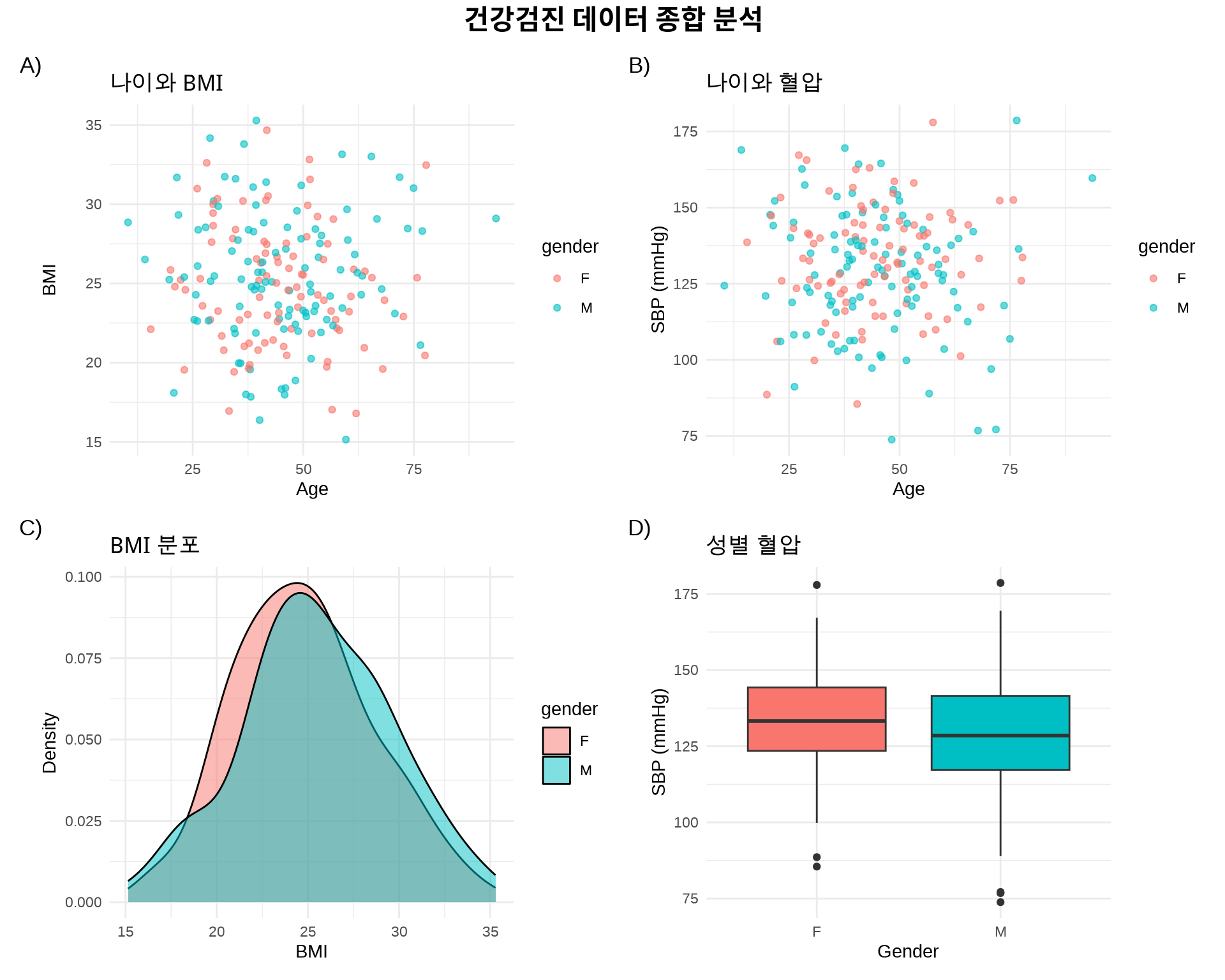# 보건학 데이터 시뮬레이션set.seed(123)health_sim<-tibble( age =rnorm(200, mean =45, sd =15), bmi =rnorm(200, mean =25, sd =4), sbp =rnorm(200, mean =130, sd =20), gender =sample(c("M", "F"), 200, replace =TRUE))# 4개 플롯 생성p_age_bmi<-ggplot(health_sim, aes(x =age, y =bmi, color =gender))+geom_point(alpha =0.6)+labs(title ="나이와 BMI", x ="Age", y ="BMI")+theme_minimal()p_age_sbp<-ggplot(health_sim, aes(x =age, y =sbp, color =gender))+geom_point(alpha =0.6)+labs(title ="나이와 혈압", x ="Age", y ="SBP (mmHg)")+theme_minimal()p_bmi_dist<-ggplot(health_sim, aes(x =bmi, fill =gender))+geom_density(alpha =0.5)+labs(title ="BMI 분포", x ="BMI", y ="Density")+theme_minimal()p_sbp_box<-ggplot(health_sim, aes(x =gender, y =sbp, fill =gender))+geom_boxplot(show.legend =FALSE)+labs(title ="성별 혈압", x ="Gender", y ="SBP (mmHg)")+theme_minimal()# 레이아웃: 2x2 그리드(p_age_bmi|p_age_sbp)/(p_bmi_dist|p_sbp_box)+plot_annotation( title ="건강검진 데이터 종합 분석", tag_levels ="A", tag_suffix =")", theme =theme(plot.title =element_text(size =16, face ="bold", hjust =0.5)))