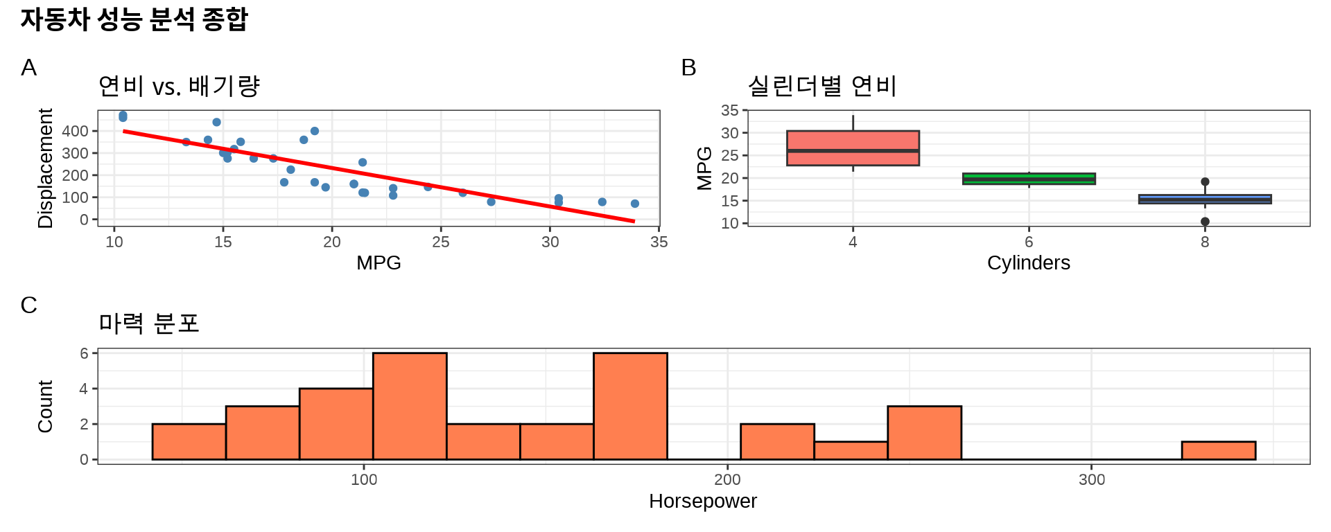 library(patchwork)# 3개의 독립적인 플롯 생성p1<-ggplot(mtcars, aes(x =mpg, y =disp))+geom_point(color ="steelblue")+geom_smooth(method ="lm", se =FALSE, color ="red")+labs(title ="연비 vs. 배기량", x ="MPG", y ="Displacement")+theme_bw()p2<-ggplot(mtcars, aes(x =factor(cyl), y =mpg, fill =factor(cyl)))+geom_boxplot(show.legend =FALSE)+labs(title ="실린더별 연비", x ="Cylinders", y ="MPG")+theme_bw()p3<-ggplot(mtcars, aes(x =hp))+geom_histogram(bins =15, fill ="coral", color ="black")+labs(title ="마력 분포", x ="Horsepower", y ="Count")+theme_bw()# 조합: p1과 p2를 나란히, 그 아래 p3(p1|p2)/p3+plot_annotation( title ="자동차 성능 분석 종합", tag_levels ="A", # A, B, C 자동 라벨 theme =theme(plot.title =element_text(size =14, face ="bold")))
