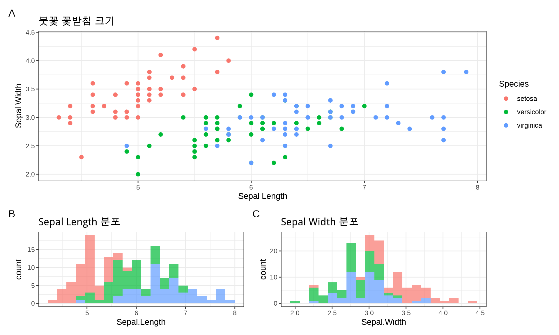 # 플롯 생성p_main<-ggplot(iris, aes(x =Sepal.Length, y =Sepal.Width, color =Species))+geom_point(size =2)+labs(title ="붓꽃 꽃받침 크기", x ="Sepal Length", y ="Sepal Width")+theme_bw()p_hist_x<-ggplot(iris, aes(x =Sepal.Length, fill =Species))+geom_histogram(bins =20, alpha =0.7)+labs(title ="Sepal Length 분포")+theme_bw()+theme(legend.position ="none")p_hist_y<-ggplot(iris, aes(x =Sepal.Width, fill =Species))+geom_histogram(bins =20, alpha =0.7)+labs(title ="Sepal Width 분포")+theme_bw()+theme(legend.position ="none")# 레이아웃: p_main이 더 큰 공간 차지p_main/(p_hist_x|p_hist_y)+plot_layout(heights =c(2, 1))+# 높이 비율 2:1plot_annotation(tag_levels ="A")