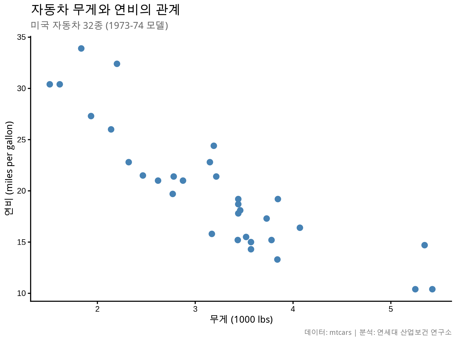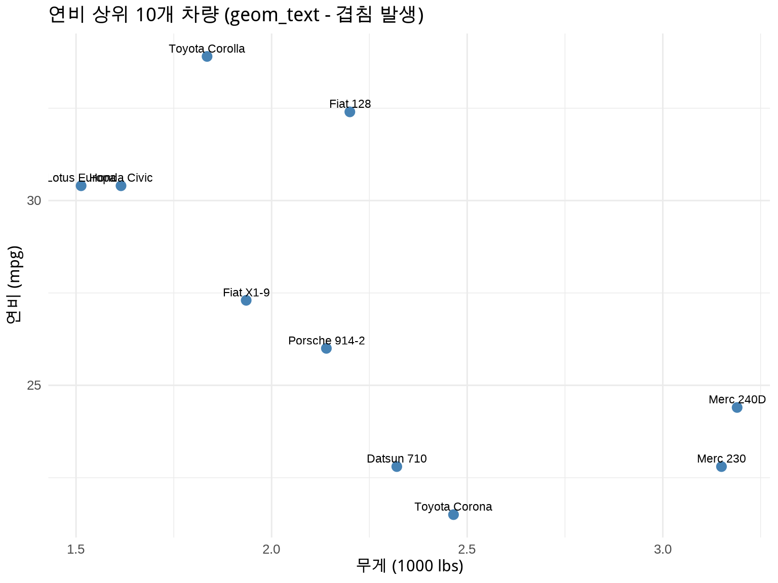 library(ggrepel)# 해결: 라벨이 자동으로 위치 조정ggplot(mtcars_labeled, aes(x =wt, y =mpg, label =model))+geom_point(color ="steelblue", size =3)+geom_text_repel( size =3, box.padding =0.5, # 라벨 주변 여백 point.padding =0.3, # 점 주변 여백 segment.color ="grey50", # 연결선 색상 max.overlaps =20# 최대 겹침 허용 수)+labs( title ="연비 상위 10개 차량 (geom_text_repel - 겹침 없음)", x ="무게 (1000 lbs)", y ="연비 (mpg)")+theme_minimal(base_size =12)