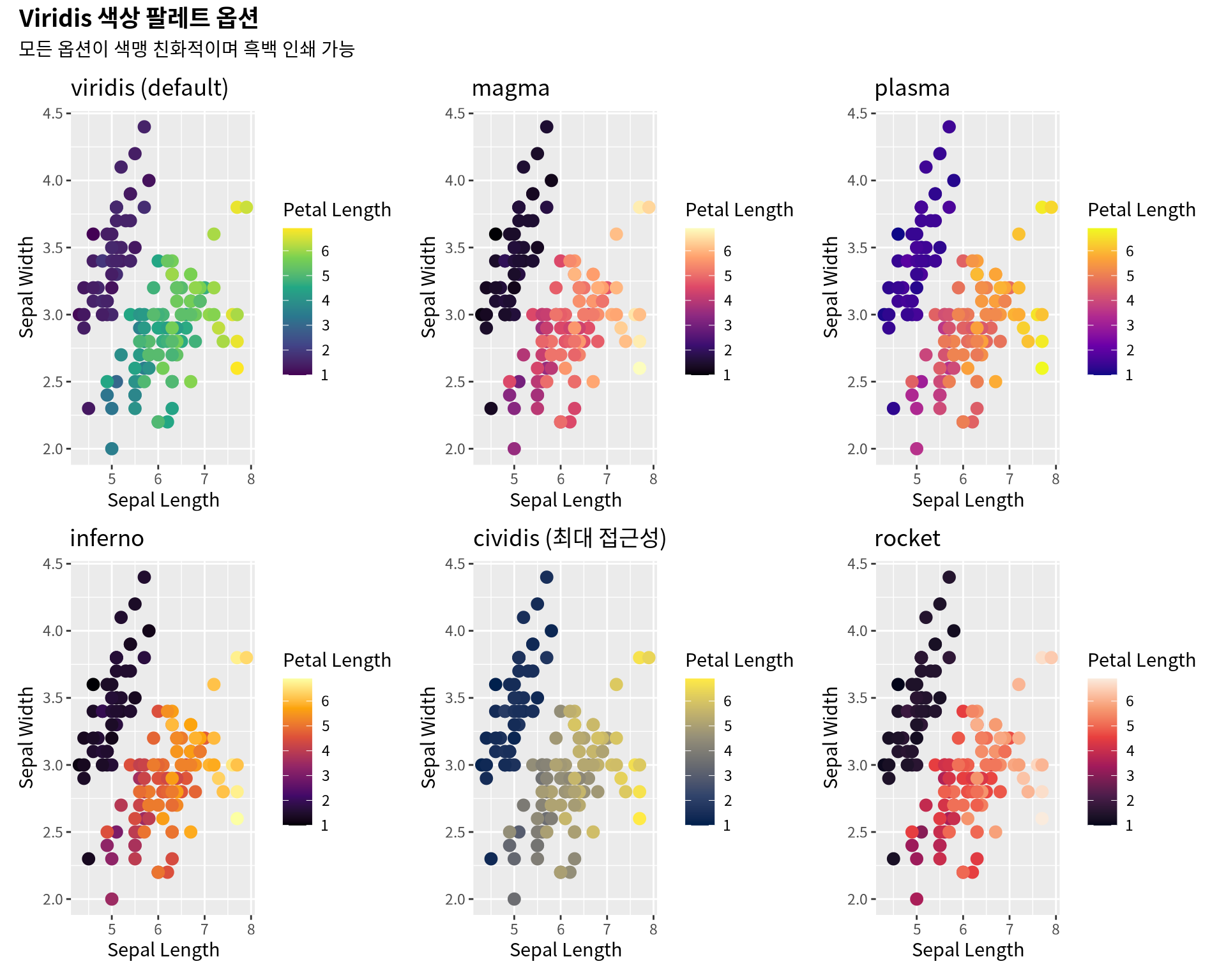 library(viridis)# 기본 플롯base_plot<-ggplot(iris, aes(x =Sepal.Length, y =Sepal.Width, color =Petal.Length))+geom_point(size =3)+labs(x ="Sepal Length", y ="Sepal Width", color ="Petal Length")# 5가지 Viridis 옵션p_viridis<-base_plot+scale_color_viridis_c(option ="viridis")+labs(title ="viridis (default)")p_magma<-base_plot+scale_color_viridis_c(option ="magma")+labs(title ="magma")p_plasma<-base_plot+scale_color_viridis_c(option ="plasma")+labs(title ="plasma")p_inferno<-base_plot+scale_color_viridis_c(option ="inferno")+labs(title ="inferno")p_cividis<-base_plot+scale_color_viridis_c(option ="cividis")+labs(title ="cividis (최대 접근성)")p_rocket<-base_plot+scale_color_viridis_c(option ="rocket")+labs(title ="rocket")(p_viridis|p_magma|p_plasma)/(p_inferno|p_cividis|p_rocket)+plot_annotation( title ="Viridis 색상 팔레트 옵션", subtitle ="모든 옵션이 색맹 친화적이며 흑백 인쇄 가능", theme =theme(plot.title =element_text(size =14, face ="bold")))