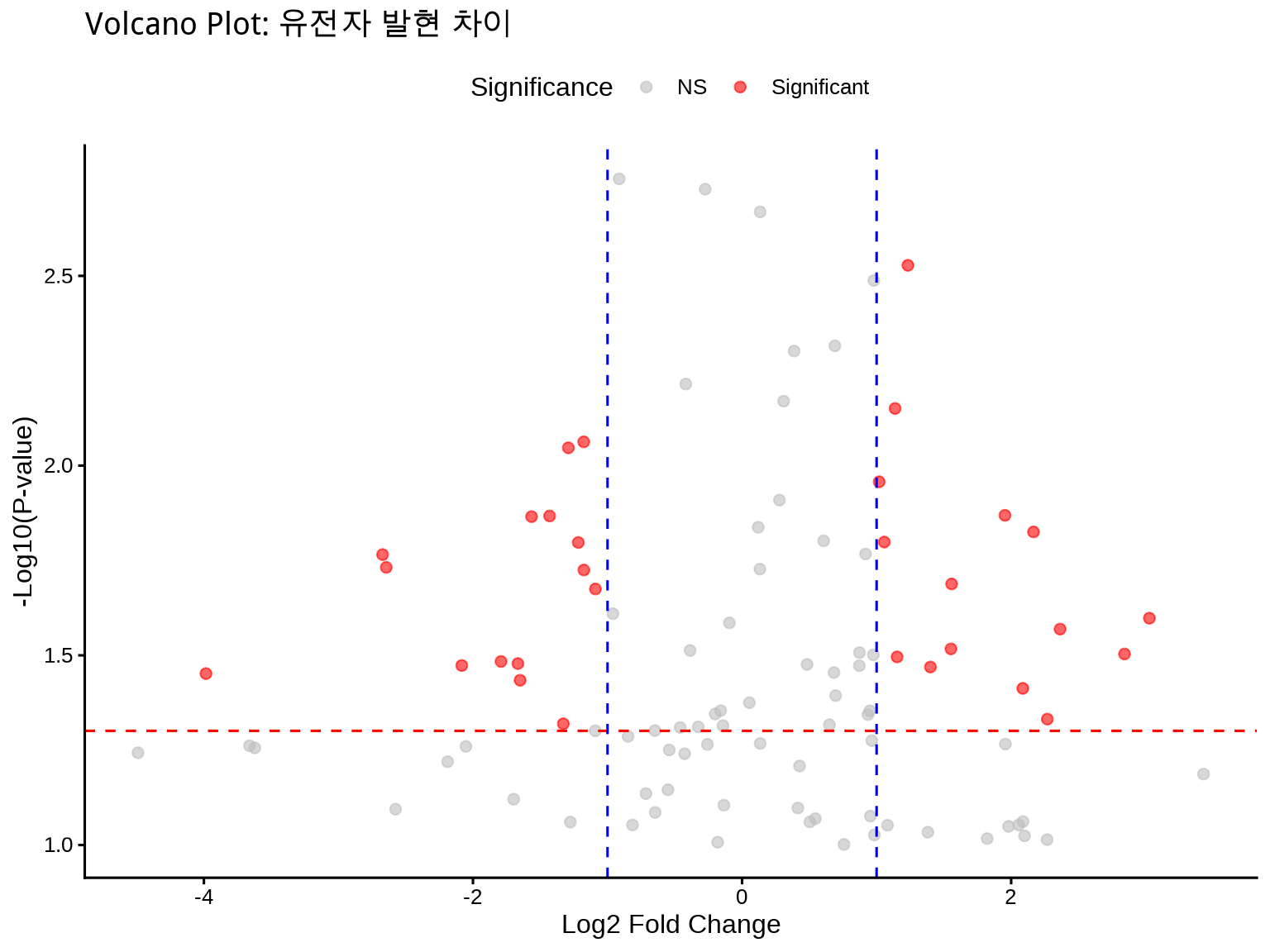# 모의 유전체 데이터 생성set.seed(42)gene_data<-tibble( gene =paste0("Gene", 1:100), log2FC =rnorm(100, mean =0, sd =1.5), pvalue =runif(100, 0, 0.1))%>%mutate( neg_log10p =-log10(pvalue), significant =ifelse(abs(log2FC)>1&pvalue<0.05, "Significant", "NS"), label =ifelse(abs(log2FC)>1.5&pvalue<0.01, gene, ""))# Volcano plotggplot(gene_data, aes(x =log2FC, y =neg_log10p))+geom_point(aes(color =significant), alpha =0.6, size =2)+geom_hline(yintercept =-log10(0.05), linetype ="dashed", color ="red")+geom_vline(xintercept =c(-1, 1), linetype ="dashed", color ="blue")+geom_text_repel(aes(label =label), size =3, max.overlaps =15, box.padding =0.5)+scale_color_manual(values =c("NS"="gray", "Significant"="red"))+labs( title ="Volcano Plot: 유전자 발현 차이", x ="Log2 Fold Change", y ="-Log10(P-value)", color ="Significance")+theme_classic(base_size =12)+theme(legend.position ="top")
